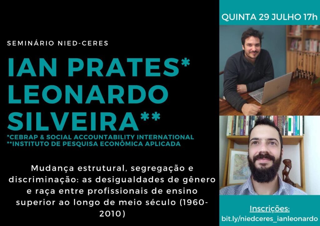No dia 29 de julho de 2021, às 17h, os Seminários NIED-CERES convidam Ian Prates (Cebrap) e Leonardo Silveira (Ipea) para apresentarem sua pesquisa Mudança, Segregação e discriminação: as desigualdades de gênero e raça entre profissionais de ensino superior ao longo de meio século (1960-2010). Para participar do seminário através da plataforma Zoom, basta se inscrever através deste link. O seminário pode ser assistido também através do canal do ciclo no YouTube.
